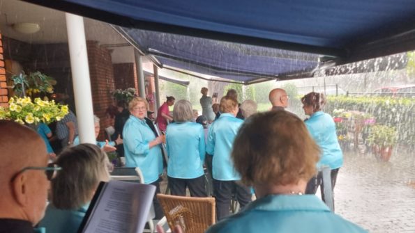 Op woensdagmiddag 15 mei traden de Kleppers op in verzorgingshuis Terra in Nijmegen. De weersverwachtingen waren goed, dus werd het optreden buiten op het zonnige terras gehouden. Onze muziek werd door de bewoners enthousiast ontvangen, maar helaas door een fikse stortbui onderbroken. Gelukkig konden we daarna de geplande liedjes alsnog zingen. Al met al een fijne middag!